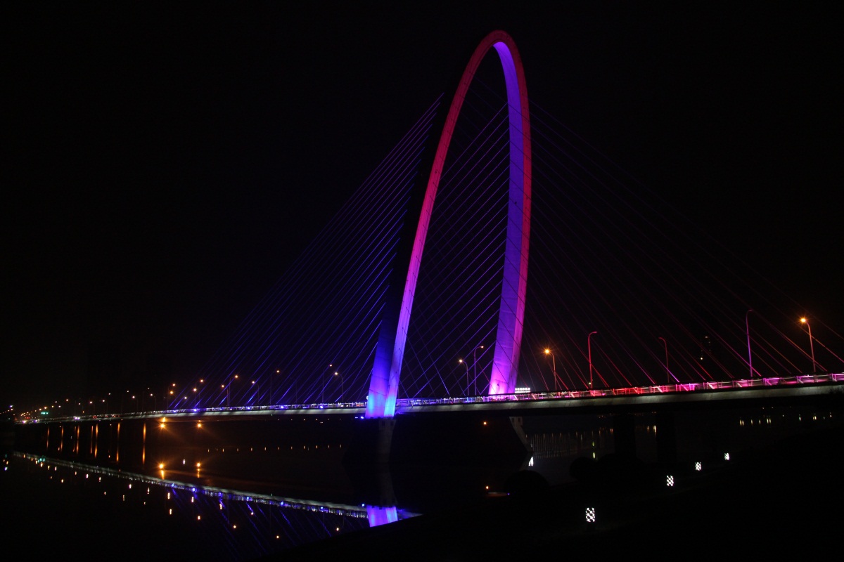 广运大桥位于东三环北段,跨越灞河,大桥全长1061米,主要由主道桥和辅道桥组成。五跨钢管拱主桥跨越灞河,每跨为50米,最大跨度达80米。主道桥桥梁全长837米,分左右幅,每幅宽16.5米,共双向八车道。工程投资2.2亿元,总工期18个月,是三环路工程中具代表性的跨河桥梁